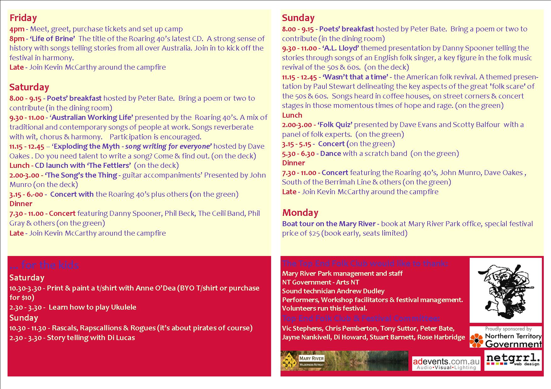 The Roaring Forties (all six) are looking forward to this year’s Top Half Folk Festival on the June long weekend (6th-9th June) at Mary River in the Northern Territory (south-east of Darwin).
